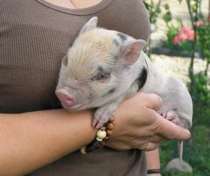 Máme na prodej miniprasátka ze dvou vrhů. Matkami jsou Binky a Baruška, otec Chrochtík, všichni rodiče jsou registrováni v Českém klubu majitelů prasátek chovaných v domácnosti, jsou čipováni klubovými čipy a vedeni v seznamu prasátek na stránkách klubu a Státní veterinární správy. Kromě toho naši čuníci pocházejí z registrovaného hospodářství a budou tetovaní. Vrh po Barušce je narozen 28.7.2011 (na videu s modrou tečkou) a po Binky 01.08.2011 (na videu s červenou tečkou). K odběru jsou selátka na přelomu srpna a září. Selátka jsou focená již odrostlejší a proto vypadají větší než předchozí vrhy focené den po narození. Na videu jsou ve věku 5 dní (po Barušce) a 1 den (po Binky).