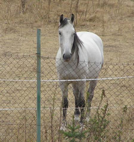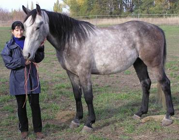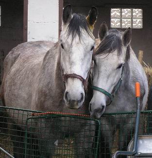že dnes už se tomu směji, když se schválně plašil a cestou do ohrady jsme si připadali jako v kovbojce když nás vláčel po břiše 20 metrů na vodítku nebo skákal jak srna a my dělali krok na zemi a dva ve vzduchu. Tehdy to odnesl jen zlomený malíček a od té doby jsem věděla, že se vodítko nemá omotávat kolem ruky. Další dobrá věc byl štajgr, to by člověk nevěřil, jak mnoho může udělat taková malá věcička. No přesto, že jsme před koupí koní přečetli asi 5 knih a vyptávali se koňáků na kde co, realita byla drsná. Ono taky vzít si pro začátek na výchovu 2 hřebečky bylo šílené, ale neustálým študováním knih a časopisů o koních, návštěvami koňských akcí a určitou dobou i jízdárny (příšerná zkušenost) jsme se do toho dostali a možná je to i dobře že jsme samouci co se týče výchovy, protože nejsme ovlivněni zažitými zvyky rádoby koňáků, při jejichž radách mi vstávají vlasy na hlavě. Dost mně překvapil i názor mladíka, (několik let údajně jezdí v jezdeckém klubu) který u nás zvonil v 6,00 ráno (a vzbudil mi mimino), s otázkou, jestli víme že venku prší, že máme koně v ohradě. Je to hrozné, když člověk, který se tak dlouho motá kolem koní neví, že déšť koně opravdu nezabije a že ho koně dokonce vyhledávají. Navíc naši koně jsou dostatečně otužilí a zvyklí již od hříbat pobývat venku za jakéhokoliv počasí a pouze při extrémních zimách, větrech apod. jdou domů do stájí. Určitě jim to prospívá a cítí se mnohem lépe, než kdyby byli zavření celý den ve stáji a ven chodili jen na vyjížďky (na ty teď moc času není).
