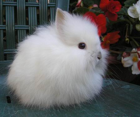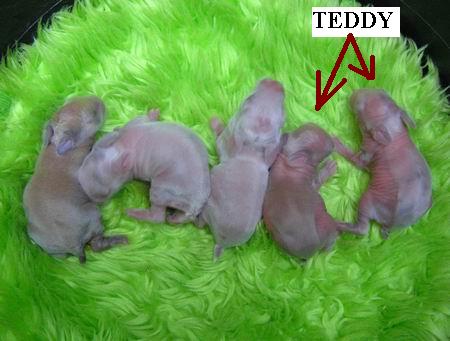 3 dny - je krásně vidět typický znak teddy - klín na zádech u dvou králíčků vpravo, ostatní jsou pouze dlouhosrstí kříženci s teddy genem |