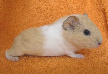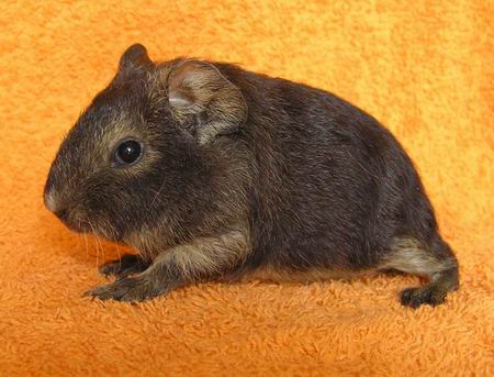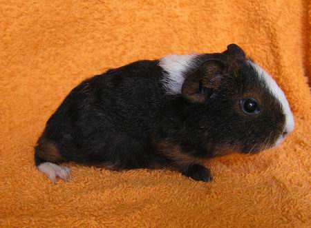 Kaplan Valmont Preston z Horeckých vrchů (No tady trošku nechápu tu kombinaci. Ve standardu plemen je kombinace krémové a černé možná a je to kresba "lux černá" a na diskuzi je každý pranýřovaný za to když prohlásí, že má černé morče s krémovou, chytráci tvrdí, že to prý není černá, ale sable. Sable má ovšem ohnivé oko a když je tato kombinace možná v této kresbě, proč není možná u strakatého morčete? Viz moje genovka Georgina, která je krásně černá s krémovou a bílou a oko má tmavé. No nikdo není dokonalý a pokud studujete genetiku morčat a řídíte se rodokmenem, potom z toho musíte být divocí, protože stejně má většina morčat v rodokmenu špatný zápis barvy v předcích. Někdy má totiž problém s určením i dospělý, natož desetileté děcko, které může mít také chovatelskou stanici.) Musím ale přiznat, že tento genáček nějakou krásně černou nemá. U něj bych to spíše odhadovala na sable. Což je ale fuk, protože genáči stejně nejdou registrovat. |